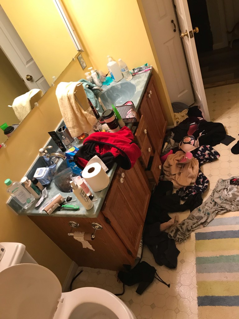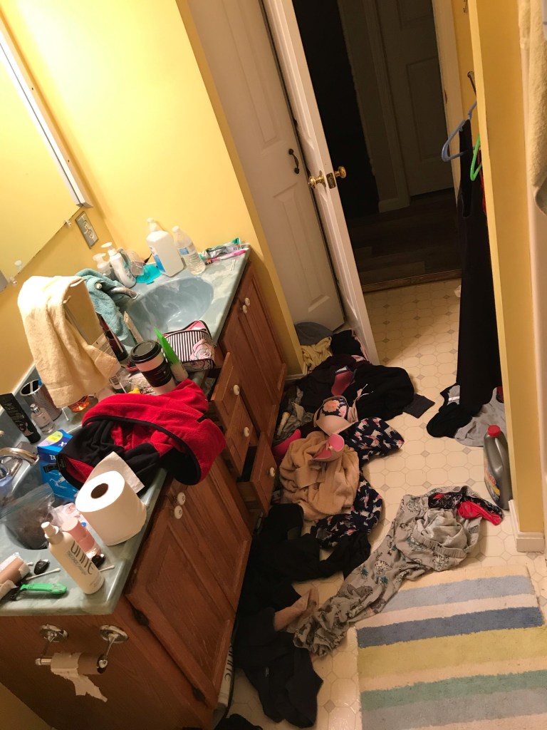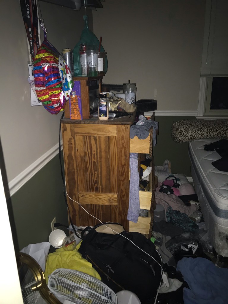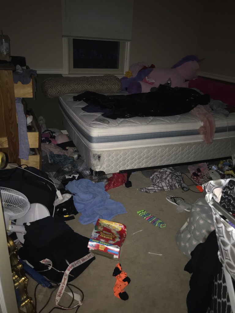 Another piece of the illness, at least in my daughters case, is how she chooses to keep her surroundings. I really can’t believe I am sharing this, but it’s part of it. I am sharing pictures of my daughter’s bedroom and the bathroom my daughter uses. I can only assume that the chaos she chooses to live in is similar to the chaos in her mind. Both my husband and myself have cleaned her room and bathroom numerous times – always with the promise that this time she will keep it clean. The pictures don’t show the shit that is stuffed behind the bed or under the bed. And I never know what I will find shoved in drawers.