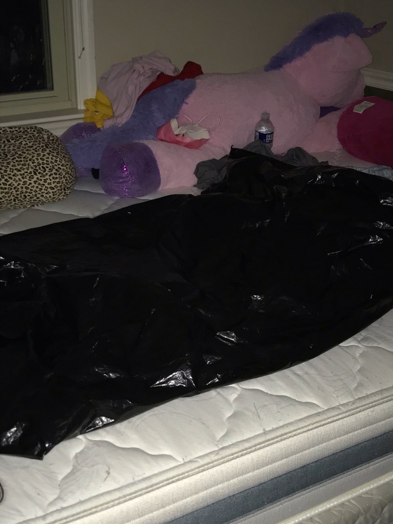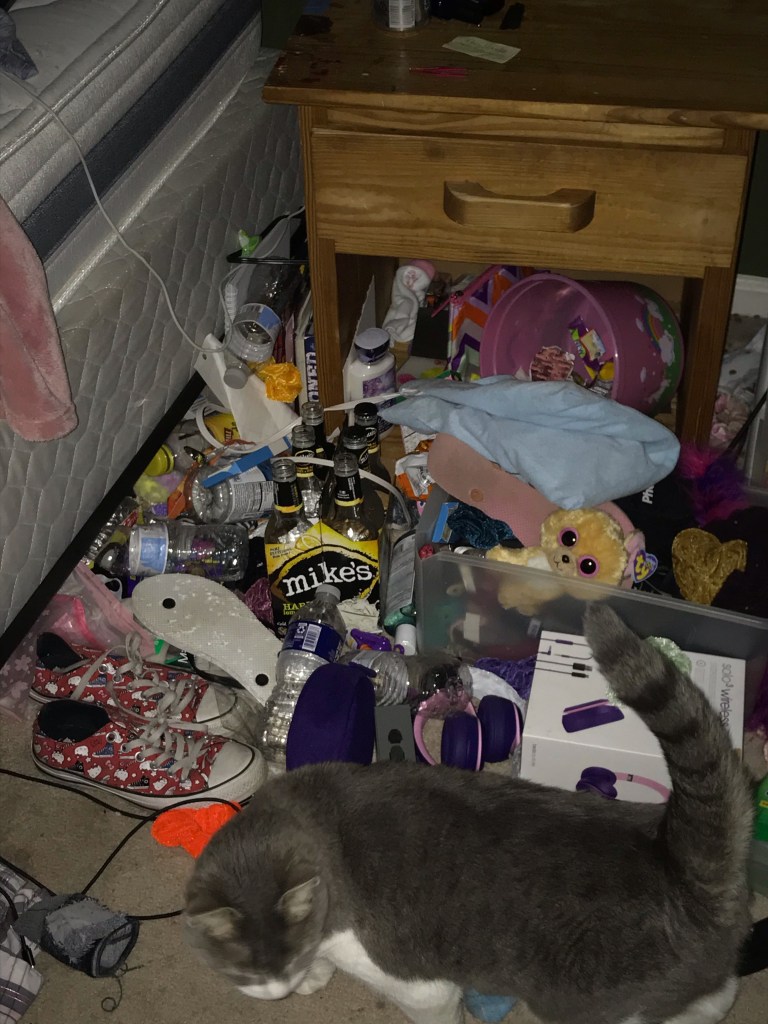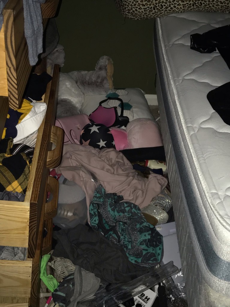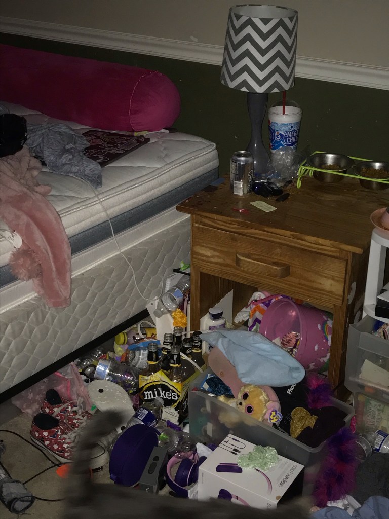 Another piece of the illness, at least in my daughters case, is how she chooses to keep her surroundings. I really can’t believe I am sharing this, but it’s part of it. I am sharing pictures of my daughter’s bedroom and the bathroom my daughter uses. I can only assume that the chaos she chooses to live in is similar to the chaos in her mind. Both my husband and myself have cleaned her room and bathroom numerous times – always with the promise that this time she will keep it clean. The pictures don’t show the shit that is stuffed behind the bed or under the bed. And I never know what I will find shoved in drawers.